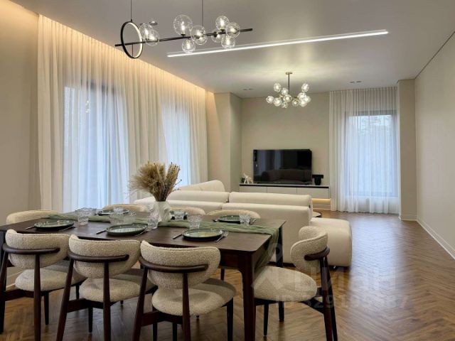 Просторная современная кухня-гостиная, площадью 37,88 м2, идеально подходит для приема гостей и семейных мероприятий, оборудована всей необходимой техникой и мебелью( телевизор с диагональю 85 дюймов, камин с функцией обогрева, 2 распашных холодильника, духовой шкаф,микроволновка, измельчитель пищевых отходов, вытяжка, индукционная плита, большая посудомоечная машина).