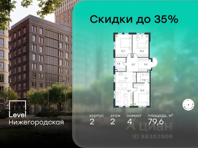 4-комн.кв. · 79,6 м² · 2/11 этаж