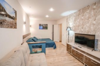 В апартаментах возможно размещение 4 человек. Спальные места: двуспальная кровать, раскладной диван. Кухня оборудована необходимой посудой и техникой: варочная поверхность, духовой шкаф, чайник, микроволновая печь, холодильник. К услугам также телевизор, бесплатный wi-fi, стиральная машина.