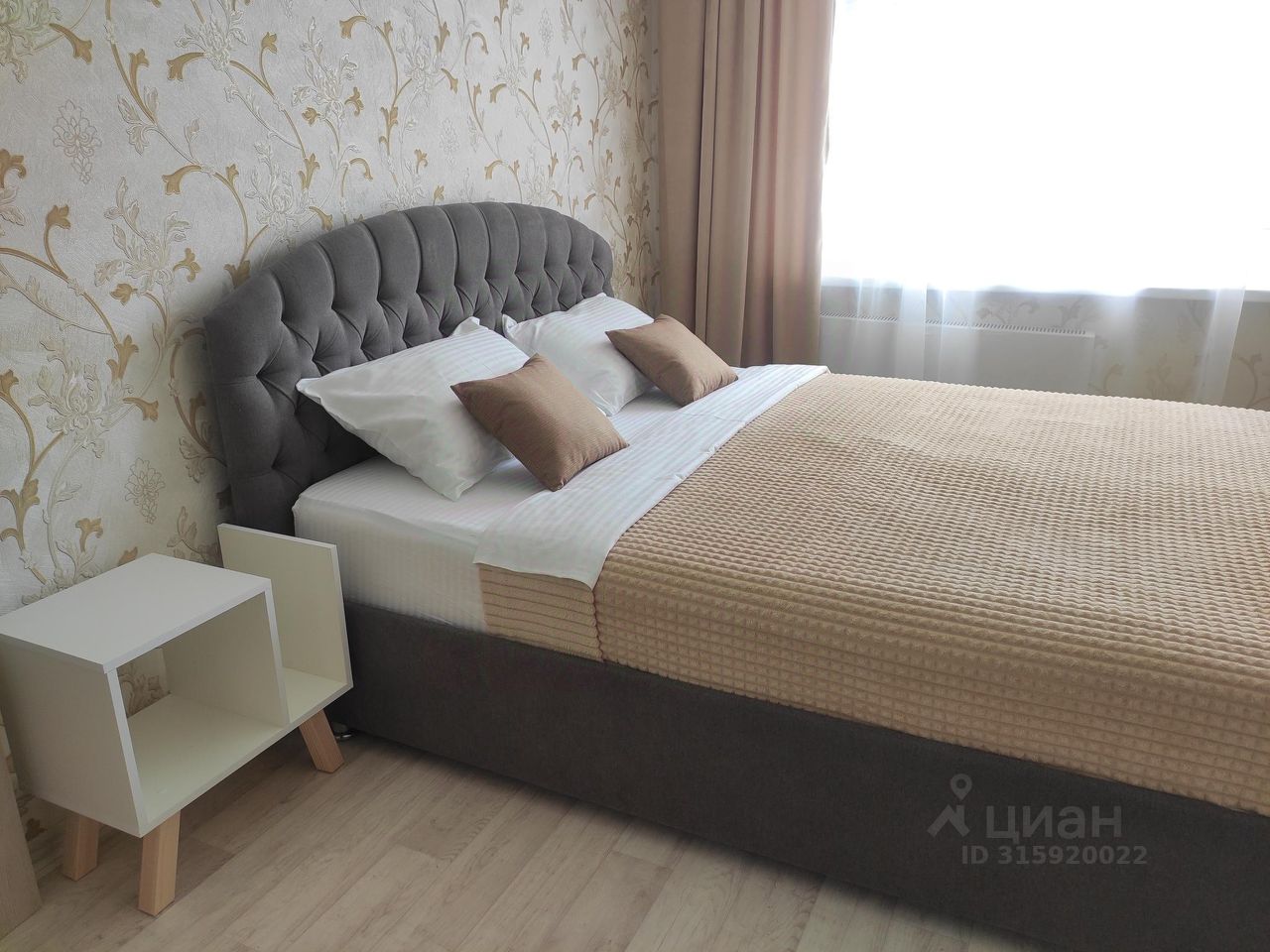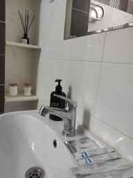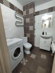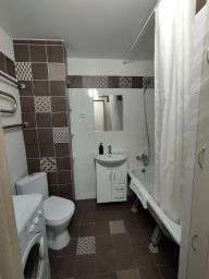 В апартаментах возможно размещение 3 человек. Спальные места: двуспальная кровать 160*200, раскладной диван 110*190. Кухня оборудована необходимой посудой и техникой: холодильник, чайник, варочная поверхность, духовой шкаф, микроволновая печь. К услугам гостей также wi-fi, телевизор, стиральная машина, фен, утюг, гладильная доска, постельное белье, полотенца, средства гигиены.