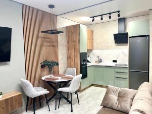 Современная квартира в новом доме, расположенном около леса. Территория огороженная, имеется детская площадка, парковка.