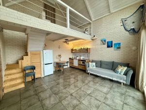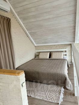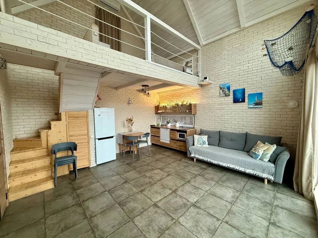 В доме двуспальная кровать на открытом втором этаже и двуспальный диван на первом этаже
