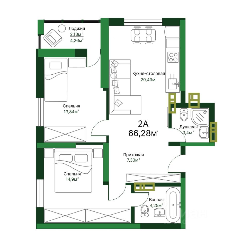 Продаётся 2-комнатная квартира в сданном доме (Люксор), срок сдачи: III-кв. 2025, общей площадью 66.56 кв.м., на 5 этаже. ЖК "Люксор"
