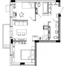 - Возможность перепланировки под разные сценарии жизни: спальня — 10 кв. м и кухня-гостиная площадью 24 кв. м или создание двух жилых комнат по 10 кв. м и большая кухня площадью 14 кв. м.