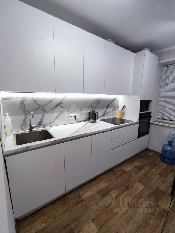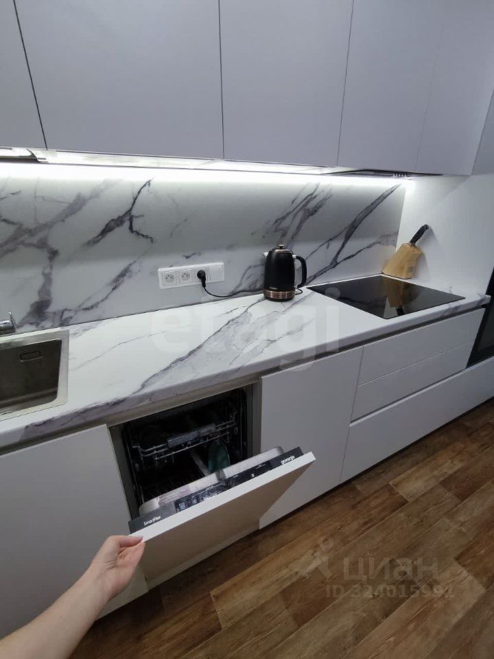 В квартире остается кухонный гарнитур, со встроенной индукционной плитой. Шкаф-пенал со встроенным духовым шкафом.