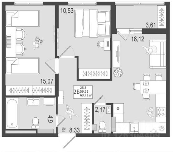 Высокие потолки 2,73 м — ощущение простора и света.