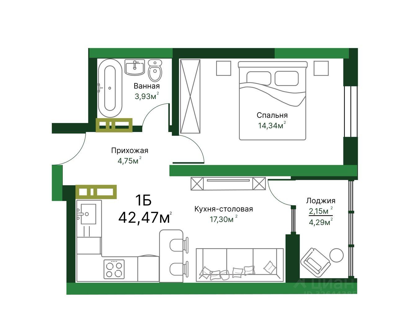 ПЛАНИРОВКА 1Б (42.47 м²)