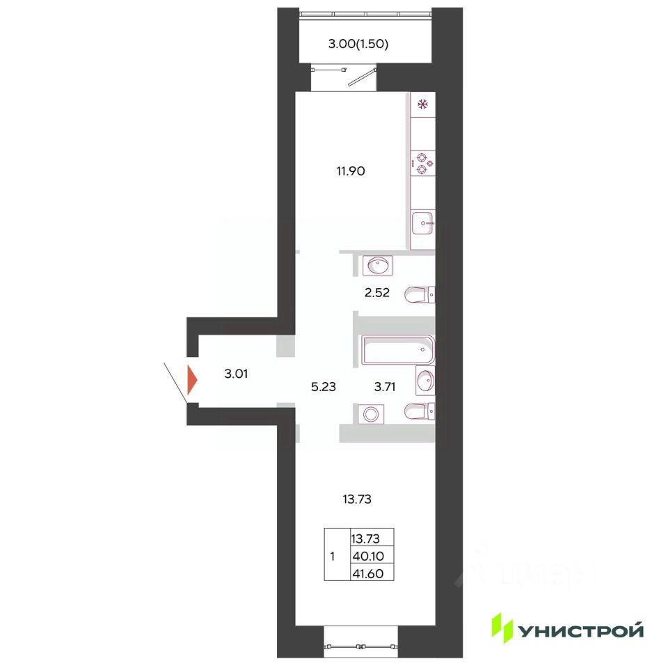 Общая площадь41,6 м²