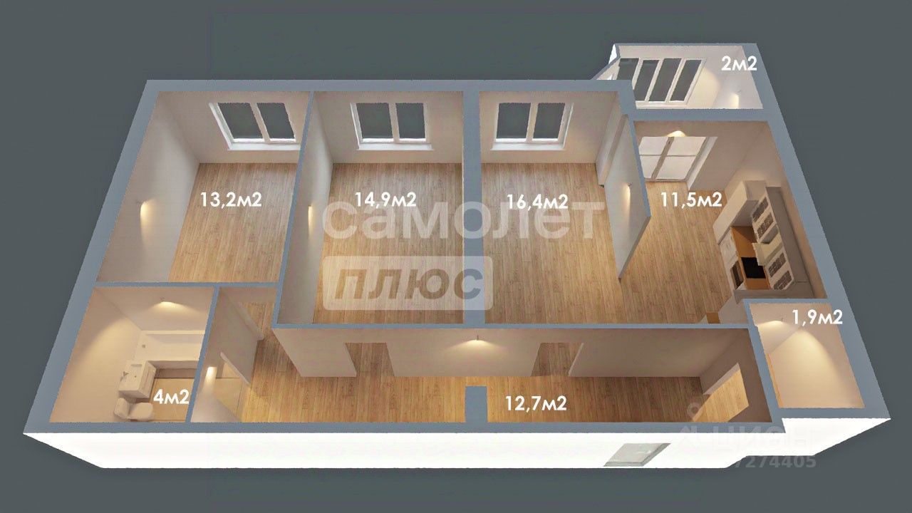 Просторная жилая зона площадью 44,5 квадратных метров, удобная планировка комнат (13,2 + 14,9 + 16,4 м²) и кухни площадью 11,5 м²