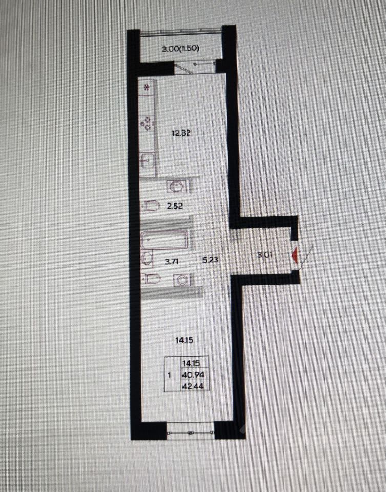 О квартире: Общая площадь 42,4м, жилая 14,1м, кухня-гостиная 12,3м, с/узел раздельный